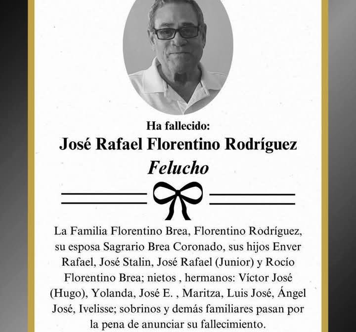José Rafael Florentino Rodríguez (Felucho) ha sido parte integrante de toda mi familia y yo, en parte de la suya. La fidelidad permanecerá más allá de nuestra existencia, escribió Rafael Pérez Modesto invitando a dar el último adiós al también luchador anti trujillista, quien falleció este domingo y será velado en la Funeraria Blandino en la Capital.