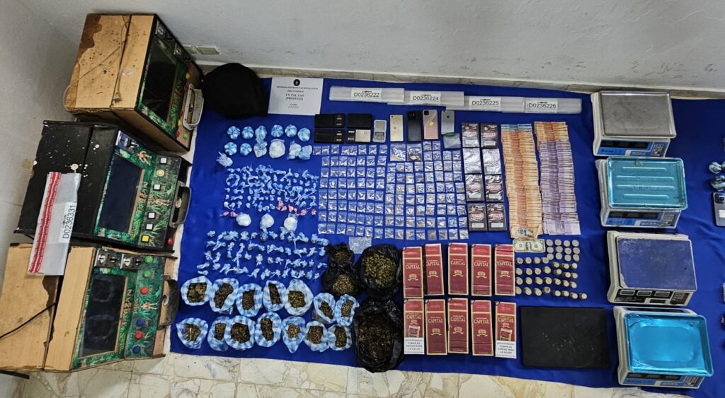 Además, se ocuparon 18 balanzas, 11 celulares, 4 máquinas tragamonedas, varias cajas de cigarrillos, 2 computadoras portátiles, RD$34,170 pesos dominicanos, un dólar, entre otras evidencias.