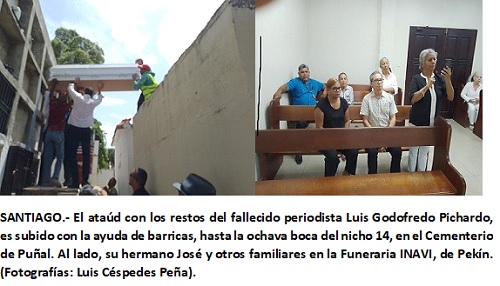 SANTIAGO, RD.- Los restos del periodista Luis Godofredo Pichardo, fueron sepultados en el Cementerio Municipal de Puñal, lugar al cual acudieron familiares, amigos y compañeros de medios de comunicaciones.