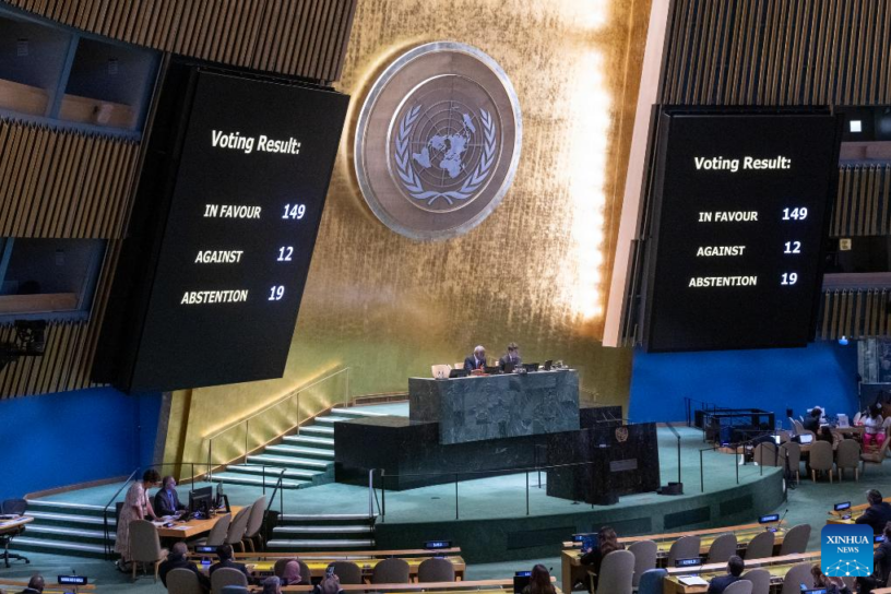 NACIONES UNIDADES, 12 junio, 2025 (Xinhua) — El resultado de la votación para adoptar una resolución que exige un cese al fuego inmediato en Gaza es visto en las pantallas durante una Sesión Especial de Emergencia de la Asamblea General, en la sede de la ONU, en Nueva York, el 12 de junio de 2025. La Asamblea General de la ONU adoptó el jueves, en una Sesión Especial de Emergencia, una resolución que exige un cese al fuego inmediato en Gaza y también el acceso inmediato de la asistencia humanitaria en gran escala. (Xinhua/Eskinder Debebe/ONU)