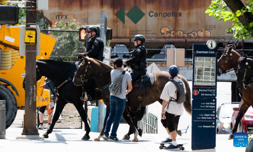 CALGARY, 16 junio, 2025 (Xinhua) — Imagen del 15 de junio de 2025 de la policía montada patrullando en una calle, en Calgary, Canadá. Una protesta tuvo lugar en Calgary previo al inicio de la cumbre del Grupo de los Siete (G7) de este año. Inicialmente prevista para comenzar el domingo, la cumbre fue acortada a dos días y dará inicio oficialmente el lunes, con la llegada de líderes mundiales a Kananaskis, en la provincia canadiense de Alberta. (Xinhua/Li Haitao)