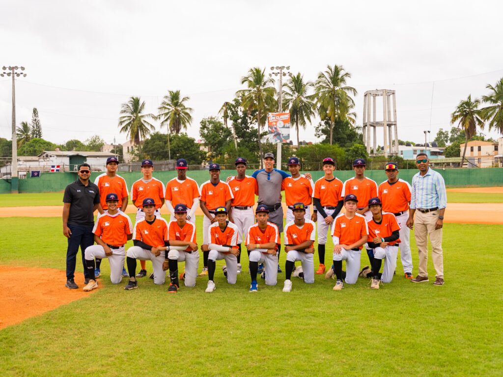 Ubaldo Jiménez junto a jugadores del equipo Orange. Le acompaña Henry González, de la oficina de MLB en el país