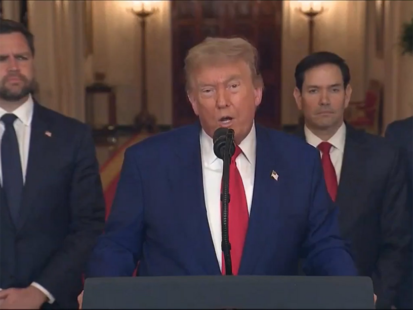 En un breve mensaje a la nación en horario de máxima audiencia, Trump, escoltado por el vicepresidente JD Vance, y sus secretarios de Estado, Marco Rubio, y de Defensa, Pete Hegseth, calificó los ataques de este sábado como un «éxito militar espectacular».