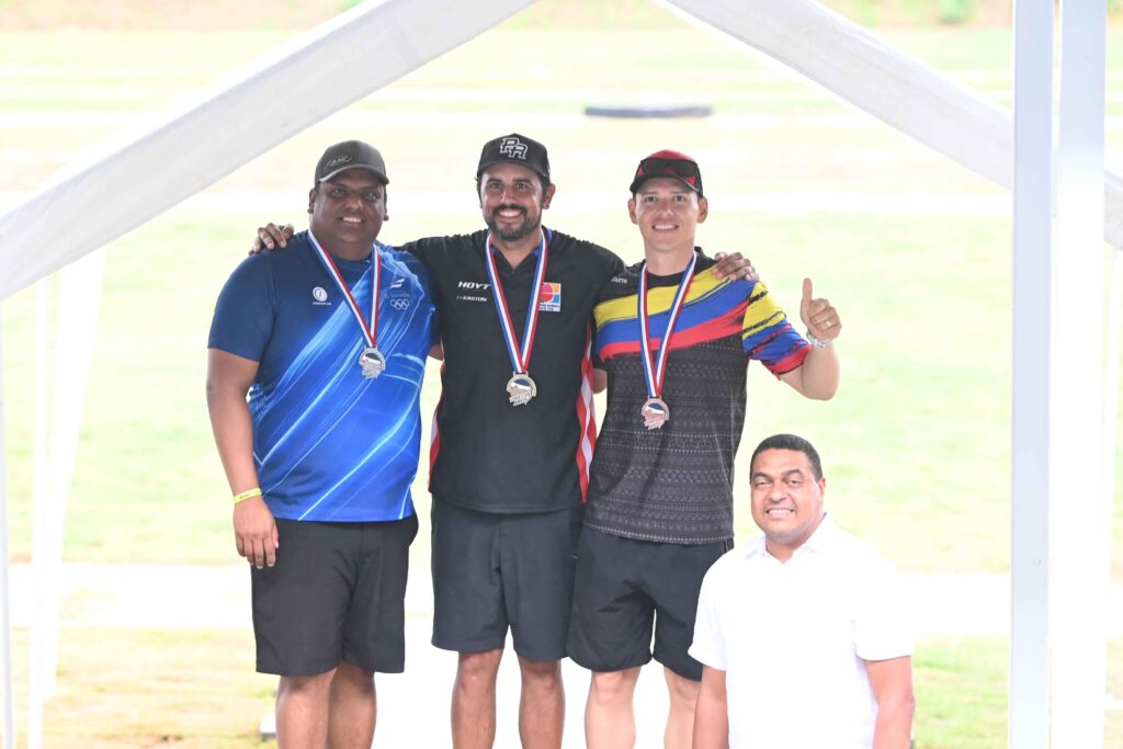 José P. Monegro, presidente del Comité Organizador de los Juegos Santo Domingo 2026, premió a Roberto Hernández, de El Salvador; Jean Pizarro Latorre, de Puerto Rico, y a Daniel Muñoz, de Colombia, medallistas arco compuesto.