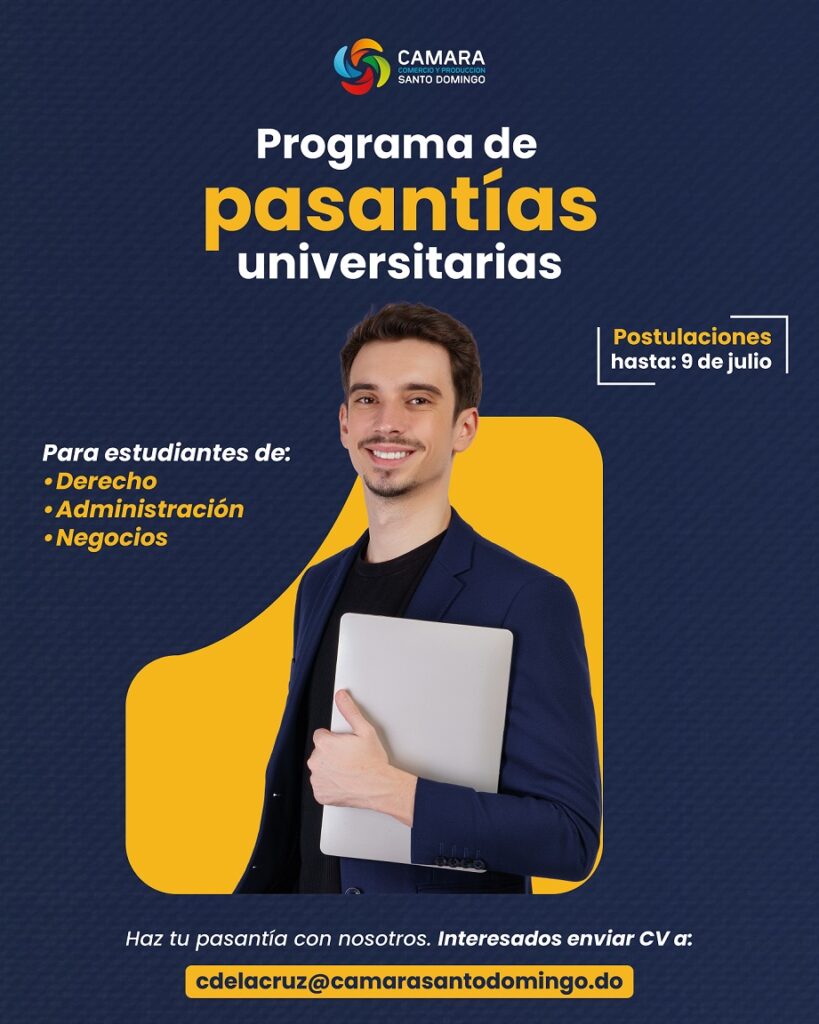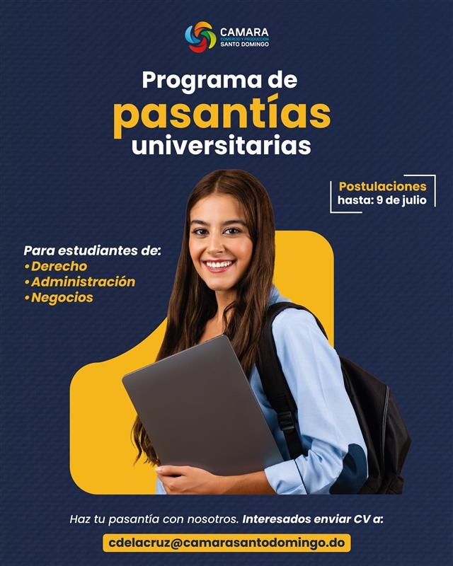 Santo Domingo, junio de 2025 – La Cámara de Comercio y Producción de Santo Domingo (CCPSD) anunció la apertura de su programa de pasantías en el área de Registro Mercantil, dirigido a estudiantes universitarios de Derecho, Administración de Empresas, Negocios y carreras afines.