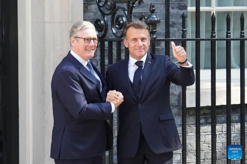 LONDRES, 10 julio, 2025 (Xinhua) — El primer ministro británico, Keir Starmer (i), recibe al presidente francés, Emmanuel Macron, en el número 10 de Downing Street, en Londres, Reino Unido, el 10 de julio de 2025. Starmer dijo el jueves que Reino Unido y Francia firmaron un nuevo acuerdo para permitir que por primera vez los dos países coordinen su disuasión nuclear. (Xinhua/Wu Lu)
