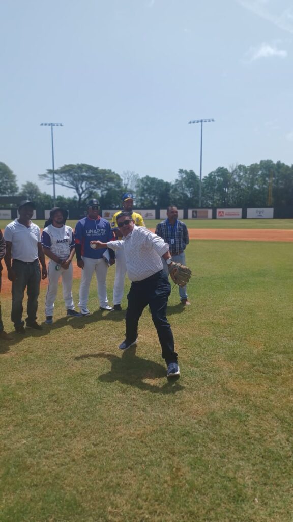 Diógenes de la Cruz, asistente del Comisionado de Béisbol Junior Noboa, realiza el pitcheo simbólico previo a la apertura del partido.