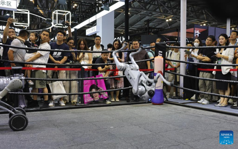 SHANGHAI, 26 julio, 2025 (Xinhua) — Personas observan a un perro robótico mostrando sus habilidades en el área de exposición de la Conferencia Mundial sobre IA y Reunión de Alto Nivel sobre la Gobernanza Global de la IA 2025, en Shanghai, en el este de China, el 26 de julio de 2025. El evento comenzó aquí el sábado. Más de 1.000 funcionarios y representantes de industrias, universidades e institutos de investigación, tanto de China como del exterior, asistieron a la ceremonia de apertura. (Xinhua/Fang Zhe)