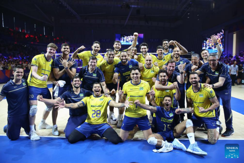 NINGBO, 3 agosto, 2025 (Xinhua) — Jugadores de Brasil festejan durante el partido por el tercer lugar entre Eslovenia y Brasil en la Ronda Final Masculina de la Liga de Naciones de Voleibol 2025, en Ningbo, en la provincia de Zhejiang, en el este de China, el 3 de agosto de 2025. (Xinhua/Suo Xianglu)