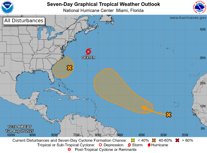 Se trata de la tormenta tropical Dexter, la cuarta de este periodo que comenzó de manera oficial el 1 de junio, que no representa una amenaza inmediata para tierra firme, pero su formación confirma que la cuenca atlántica comienza a entrar en actividad.
