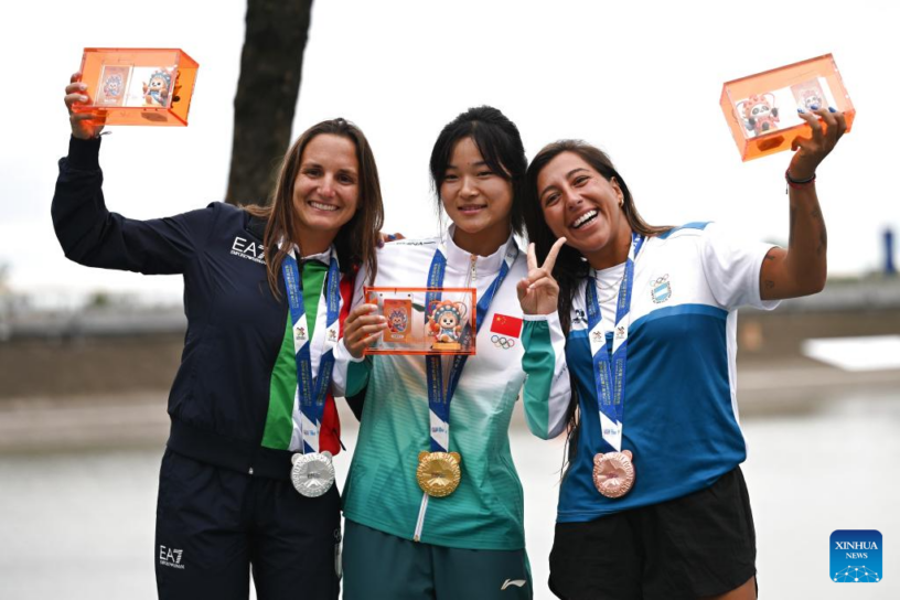 CHENGDU, 10 agosto, 2025 (Xinhua) — La medallista de oro, Xu Lu (c), de China, la medallista de plata, Alice Virag (i), de Italia, y la medallista de bronce, Eugenia de Armas, de Argentina, posan durante la ceremonia de premiación de wakeboard estilo libre femenino del evento de esquí acuático y wakeboard en los Juegos Mundiales 2025, en Chengdu, en la provincia de Sichuan, en el suroeste de China, el 10 de agosto de 2025. (Xinhua/Chen Zhenhai)