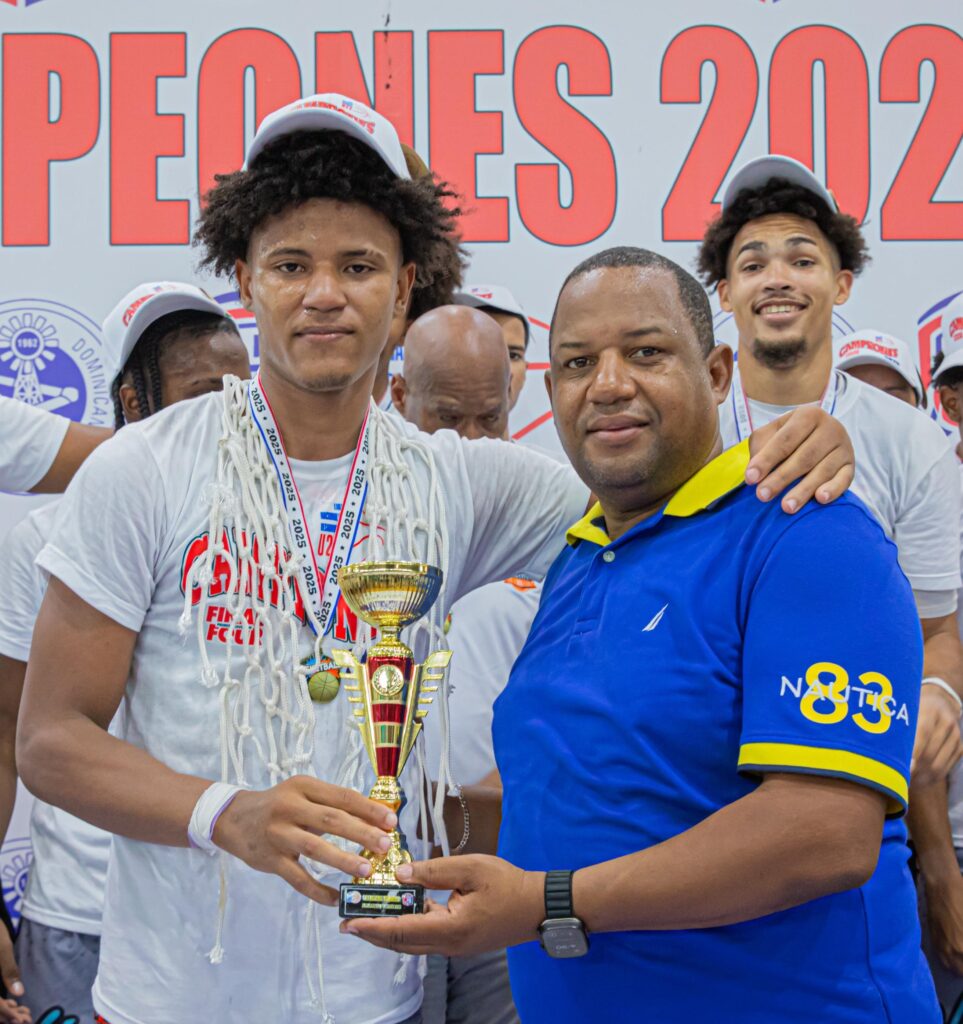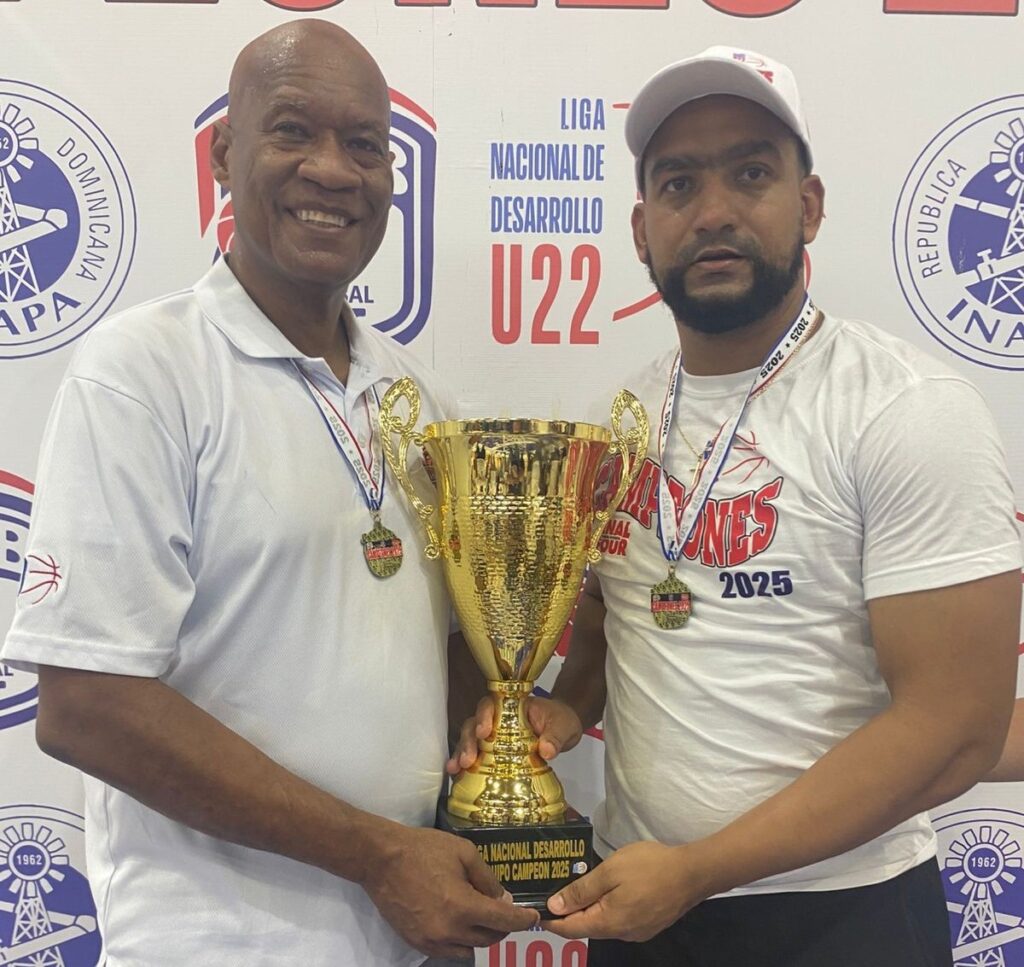 José Gil (Julito), ejecutivo de los Trenes del Este, junto al dirigente Ramón Ruiz, sostienen la Copa INAPA por ser los campeones de la LND U22 2025.