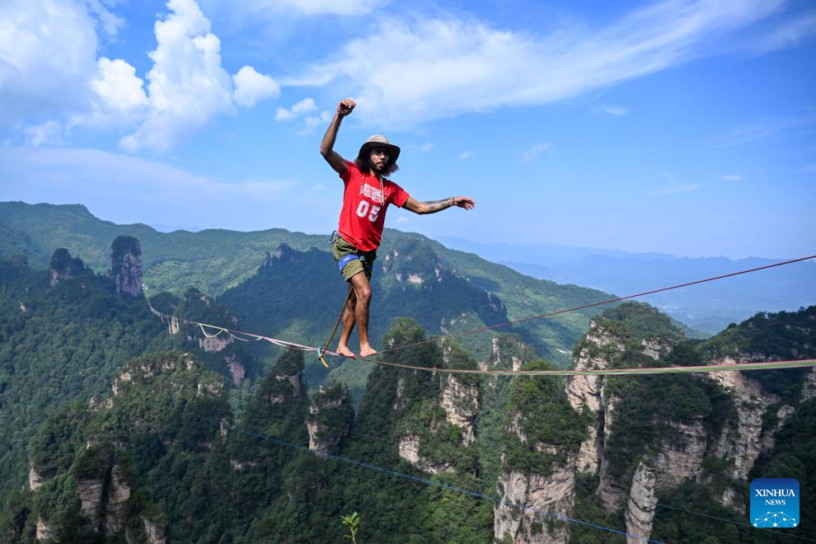 ZHANGJIAJIE, 18 agosto, 2025 (Xinhua) — Imagen tomada con un dron el 18 de agosto de 2025 de He Jinyi, de China, compitiendo durante el Campeonato «Rey del Slackline» 2025, en el punto escénico de Huangshizhai, en Zhangjiajie, en la provincia de Hunan, en el centro de China. Unos 20 atletas de élite de «Slackline» o caminata sobre cuerda de China, Francia, Brasil y otros países y regiones compitieron en el evento. (Xinhua/Guo Liliang)