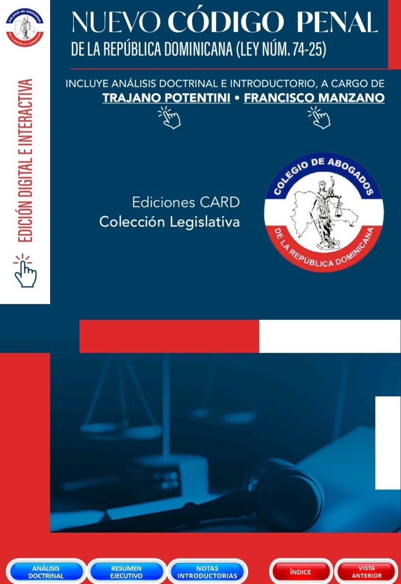 Santo Domingo, República Dominicana -20 de agosto de 2025. En un esfuerzo por fortalecer el acceso al conocimiento jurídico y fomentar una cultura de legalidad en el país, el Colegio de Abogados de la República Dominicana (CARD) anunció la puesta en circulación de una versión digital e interactiva del nuevo Código Penal dominicano, enriquecida con notas doctrinales explicativas a cargo de los reconocidos juristas Trajano Vidal Potentini y Francisco Antonio Manzano Rodríguez.