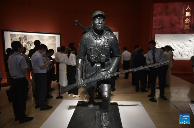 BEIJING, 25 agosto, 2025 (Xinhua) — Visitantes observan obras de arte en el Museo Nacional de Arte de China, en Beijing, capital de China, el 25 de agosto de 2025. Una exposición de arte que conmemora el 80 aniversario de la victoria en la Guerra de Resistencia del Pueblo Chino contra la Agresión Japonesa y la Guerra Mundial Antifascista se inauguró al público aquí el lunes. La exposición, que permanecerá abierta hasta el 18 de septiembre, reúne más de 300 obras de arte, entre las que se incluyen pinturas chinas, pinturas al óleo, grabados en madera y esculturas. (Xinhua/Lu Peng)