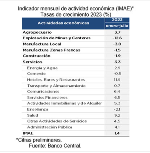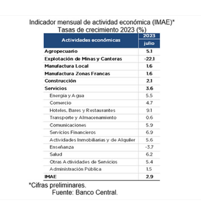 Particularmente, se observan las siguientes tasas de variación interanual en el mes de julio: sector hoteles, bares y restaurantes (9.1 %), servicios financieros (6.9 %), salud (6.2 %), servicios inmobiliarios y de alquiler (5.6 %), agropecuario (5.1 %), comunicaciones (5.9 %), comercio (4.7 %), construcción (2.1 %), manufactura local (1.6 %), manufactura de zonas francas (1.6 %), transporte y almacenamiento (0.6 %), entre otras.