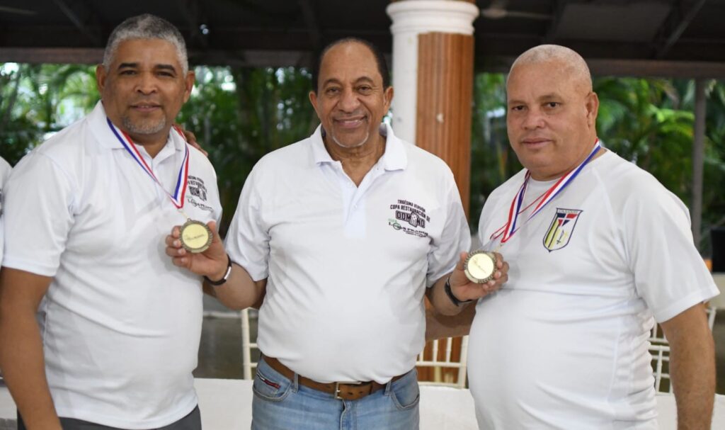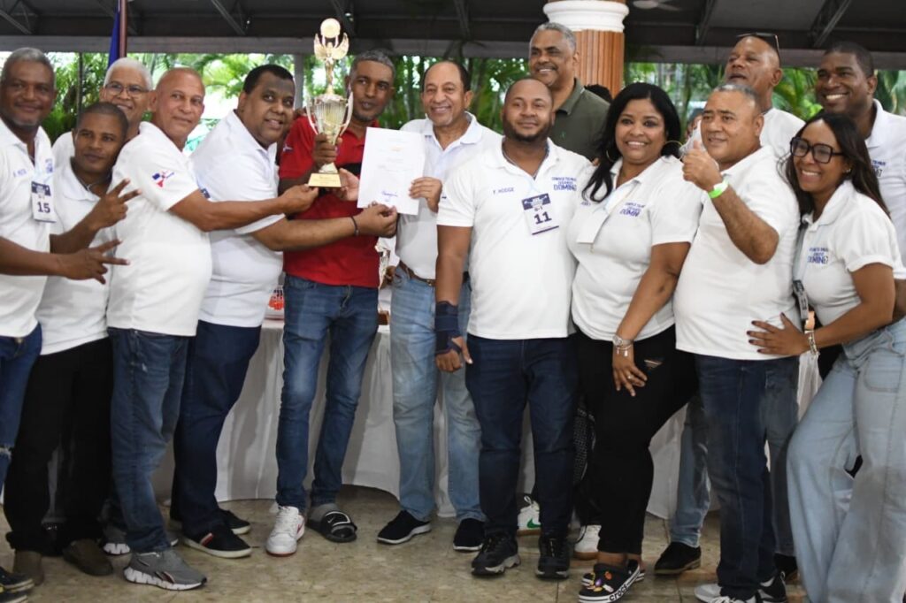 Jorge Ramírez, presidente del club Los Prados, entrega la Copa Restauración de Dominó al equipo campeón del Grupo 1, Conoce Tú País, de La Romana, junto a Héctor Junior Gil.