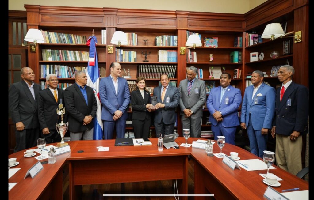 La vicepresidenta de la República Raquel Peña recibe un reconocimiento de Jorge Ramirez, presidente del club Los Prados, por la dedicatoria de la Copa Restauración de Dominó 2025. Le acompañan, desde la izquierda, Pedro Pablo Rosario, Luis Tejeda, Luis Rieca, Adolfo Pérez, Hector Junior Gil, Aleksey Ramírez, Benjamín Morales y Frank Feliz Puente.