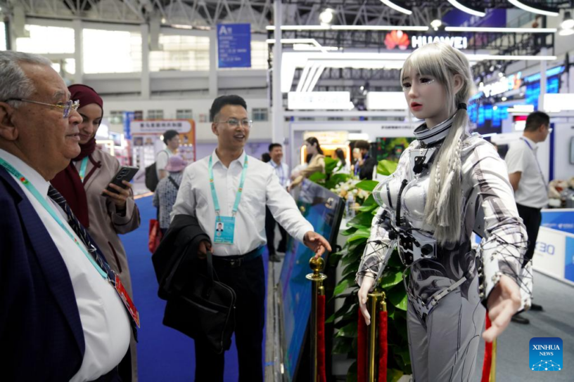 YINCHUAN, 28 agosto, 2025 (Xinhua) — Visitantes interactúan con un robot humanoide en la VII Exposición China-Estados Arabes, en Yinchuan, en la región autónoma de la etnia hui de Ningxia, en el noroeste de China, el 28 de agosto de 2025. La VII Exposición China-Estados Arabes comenzó el jueves atrayendo a más de 7.600 participantes y más de 2.200 empresas e instituciones de 75 países y regiones. (Xinhua/Zhao Yusi)