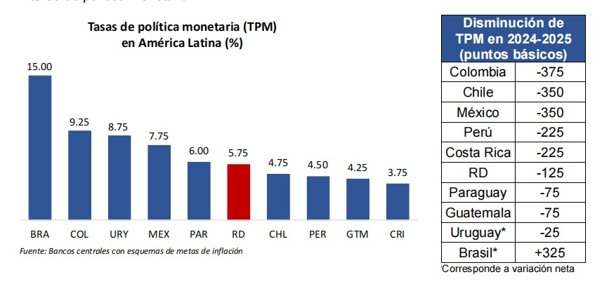El Banco Central de la República Dominicana (BCRD), en su reunión de política monetaria de julio de 2025, decidió mantener su tasa de interés de política monetaria (TPM) en 5.75 % anual. Asimismo, la tasa de la facilidad permanente de expansión de liquidez (Repos a 1 día) permanece en 6.25 % anual, mientras que la tasa de depósitos remunerados (Overnight) continúa en 4.50 % anual.