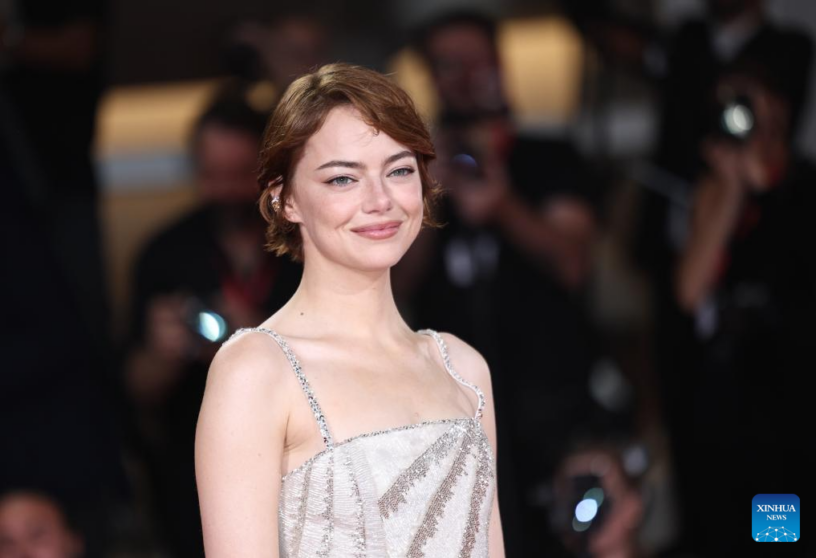 VENECIA, 29 agosto, 2025 (Xinhua) — Imagen del 28 de agosto de 2025 de Emma Stone posando para una fotografía en la alfombra roja previo al estreno de la película «Bugonia» durante el 82° Festival de Cine de Venecia, en Venecia, Italia. (Xinhua/Li Jing)