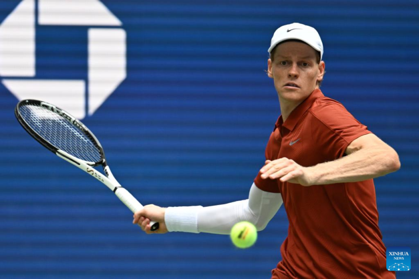 NUEVA YORK, 29 agosto, 2025 (Xinhua) — Imagen del 28 de agosto de 2025 de Jannik Sinner devolviendo la pelota durante el partido de la segunda ronda de individuales masculinos entre Jannik Sinner, de Italia, y Alexei Popyrin, de Australia, en el campeonato de tenis US Open 2025, en Nueva York, Estados Unidos. (Xinhua/Li Rui)