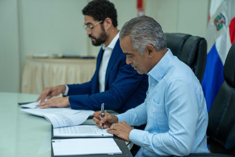 El Ministro Joel Santos durante firma de acuerdo con el presidente del consorcio, Félix Manuel Santana Reyes.