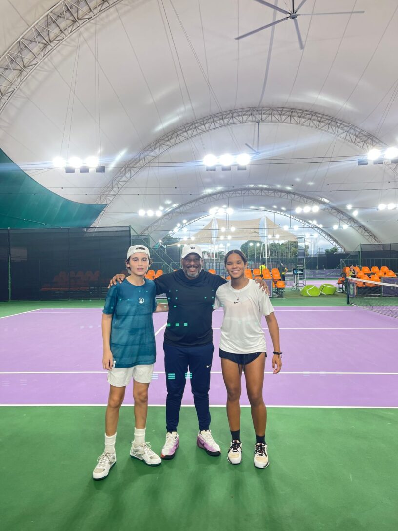 Los tenistas dominicanos Miguel Baquero y Julianny De La Cruz, junto al capitán, Freddy Damián Calderón.