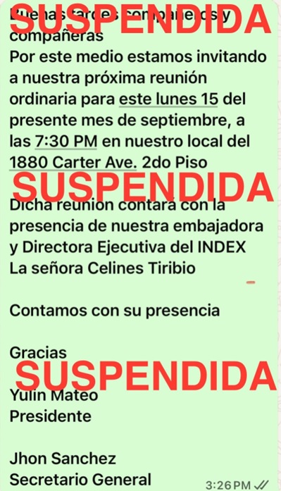 A la embajadora y directora ejecutiva del Index, Celinés Toribio, dirigentes y militantes del PRM-NY le hicieron el «fua» al oponerse a su presencia en el local del partido este lunes para ella hablarles, abrazarles y compartir con los «compañeros». Alegan que ella es «paracaidista», nunca mencionó el partido, ni hizo la más mínima campaña y la impusieron de «chuflay» por influencia de un legislador en RD. ¡Huumm! El secretario general del PRM-NY, John Sánchez, es el director del Index-NY, con $ueldo, pre$upuesto, ga$tos de representación, dieta, ga$olina e imprevi$tos; ¡Uff!; quiso introducir a Celinés al partido, pero el 90% de los 125 miembros de la Comisión Ejecutiva (CE) le dijo no, no, no a John, porque como directivo del Index y secretario general del partido oficial también ha hecho un flaco servicio y maneja la institución como si fuera una finca de su propiedad. La invitación suspendida: «Buenas tardes compañeros(as). Por este medio estamos invitando a nuestra próxima reunión ordinaria para este lunes 15 del presente mes de septiembre, a las 7:30 PM en nuestro local del 1880 Carter Ave. 2do. Piso. Dicha reunión contará con la presencia de nuestra embajadora y directora ejecutiva del Index, la señora Celinés Toribio. Contamos con su presencia. Gracias. Yulín Mateo. Presidente. «Esa fue la invitación que circulo por varios días, pero suspendida, volvió a circular entre los «perremeeces». ¡Ay, ay, ay!