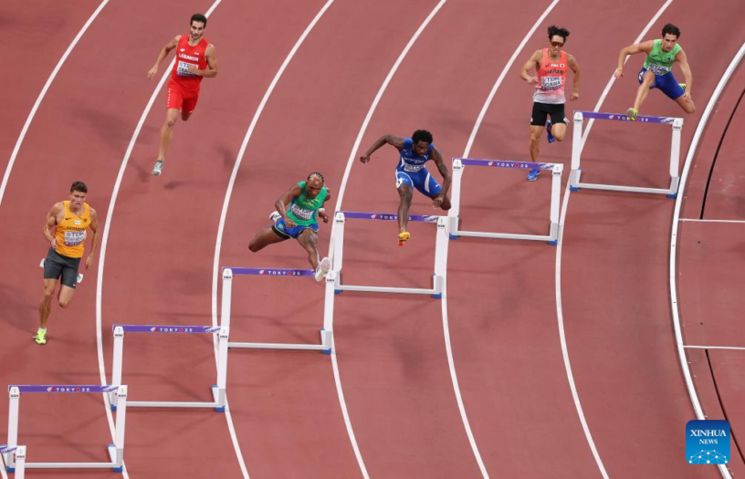 TOKIO, 16 septiembre, 2025 (Xinhua) — Imagen del 15 de septiembre de 2025 de Alison Dos Santos (3-i), de Brasil, compitiendo durante las eliminatorias de 400m con vallas masculinos, en el Campeonato Mundial de Atletismo de 2025 en Tokio, Japón. (Xinhua/Jia Haocheng)