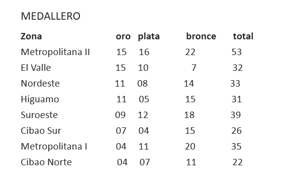 El Nordeste consiguió tres medallas de oro, tres de plata y una de bronce, mientras que Metropolitana II obtuvo tres metales dorados, dos de plata y tres de bronce. Cibao Norte se anotó un oro, dos platas y cuatro metales de bronce.
