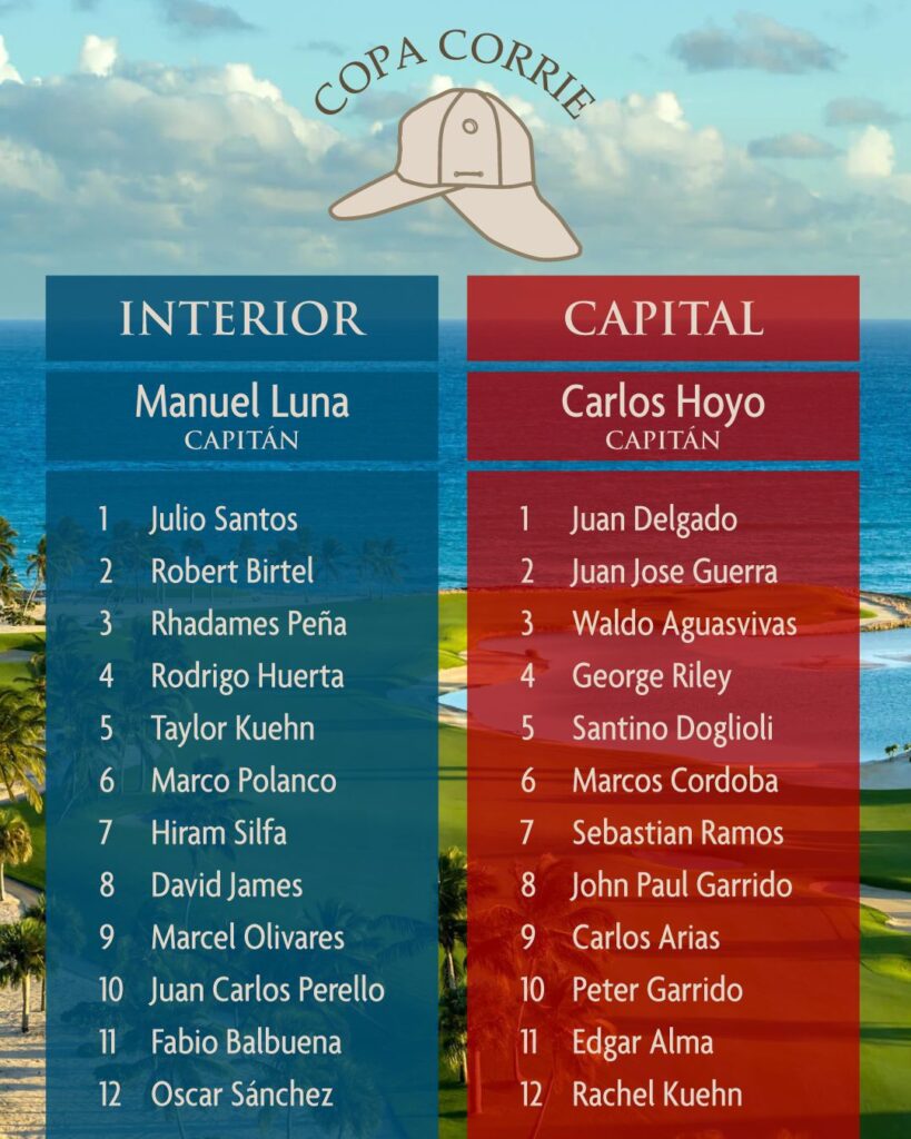 SANTO DOMINGO, RD- Los capitanes de los equipos de la Capital y el Interior del país, Carlos Hoyo y Manuel Luna respectivamente, anunciaron los 12 mejores jugadores de cada demarcación que verán acción en la próxima Copa Corrie que se celebrará del 7 al 9 de noviembre en el campo de golf de Punta Espada en Cap Cana.