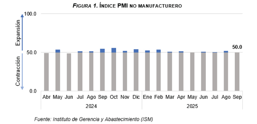 Por su parte, el índice de gestores de compras (PMI por sus siglas en inglés) no manufacturero del Instituto de Gerencia y Abastecimiento (ISM por sus siglas en inglés) registró un valor de 50.0 en el mes de septiembre, por debajo del 51.7 observado en agosto; no obstante, indica que sigue habiendo dinamismo en el sector servicios, en el cual se emplea gran parte de la diáspora dominicana.
