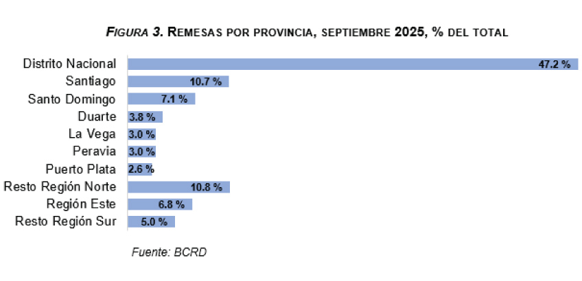 Respecto a la distribución de las remesas recibidas por provincias, el BCRD señala que el Distrito Nacional recibió una proporción del 47.2 % durante septiembre, seguido por las provincias de Santiago y Santo Domingo, con un 10.7 % y 7.1 %, respectivamente. Esto indica que cerca de dos terceras partes de las remesas (65.0 %) se recibe en las zonas metropolitanas del país.