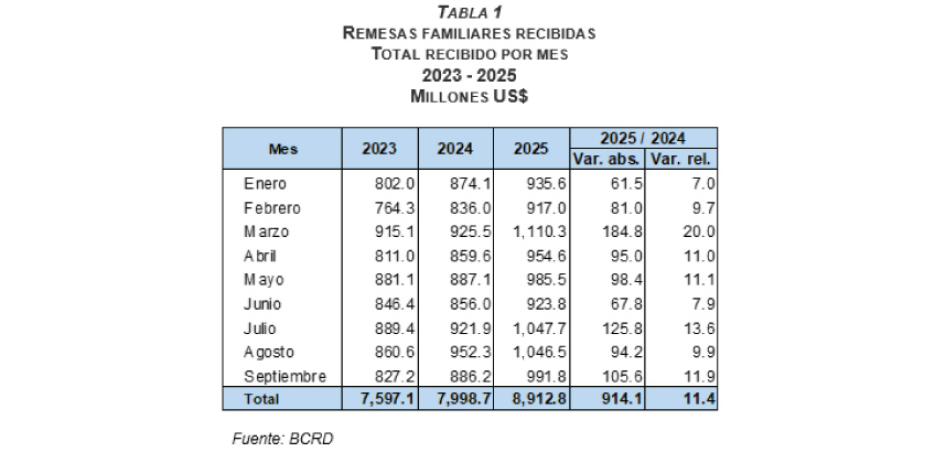 Santo Domingo, RD. El Banco Central de la República Dominicana (BCRD) informa que, entre enero y septiembre de 2025, las remesas recibidas alcanzaron la cifra de US$8,912.8 millones, aumentando US$914.1 millones (11.4 %) en comparación con el mismo período del año anterior. Particularmente, en el mes de septiembre se recibieron US$991.8 millones, un incremento de US$105.6 (11.9 %) respecto a septiembre de 2024. Cabe destacar que, estos recursos suministrados por la diáspora dominicana en el exterior tienen un efecto multiplicador sobre el consumo, la inversión y el financiamiento de los sectores más vulnerables del país.