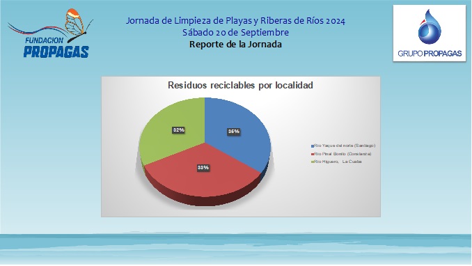 La Fundación Propagas realizó una exitosa Jornada de Limpieza de Playas, Costas y Riberas de Ríos como llamado a la conciencia ciudadana sobre la correcta gestión de los residuos sólidos, con intervenciones en el río Higüero, La Cuaba, Pedro Brand; el Arroyo Pinar Bonito, Constanza; el río Yaque del Norte y la playa El Faro en San Pedro de Macorís.
