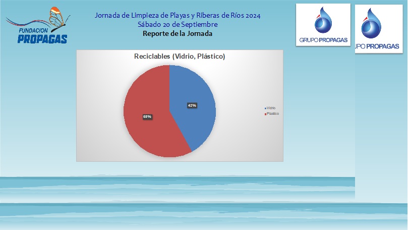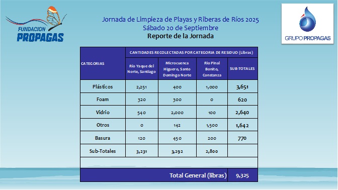 Los voluntarios clasificaron los residuos recolectados en plástico, vidrio, metales, foam y otros desechos no reciclables. Los resultados de la jornada en los cuatro puntos de la geografía nacional donde intervinieron la Fundación y el Grupo Propagas, fueron enviados al Ministerio de Medio Ambiente para sumar a la estadística nacional, y arrojaron el siguiente resultado: 3,651 libras de plástico, 2,640 libras de vidrio, 620 de foam y 770 libras de residuos no reciclables.