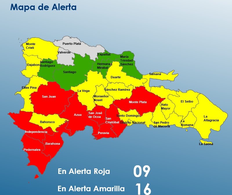 El COE mantiene 08 provincias y al Distrito Nacional en alerta roja, 16 en amarilla y aumenta 05 en verde, debido a que que el Huracán Melissa, categoría 1, en la tarde de hoy sábado, fue localizado, cerca de latitud 16.6 Norte, longitud 75.5 Oeste, próximo a unos 405 kilómetros al oeste/suroeste de Puerto Príncipe (Haití) y 210 km al sureste de Kingston (Jamaica), moviéndose hacia el oeste a 6 km/h.