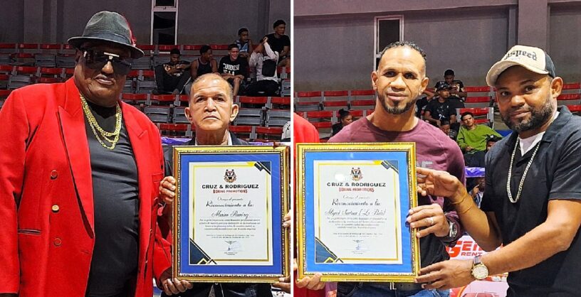 SANTIAGO DE LOS 30 CABALLEROS, Santiago, República Dominicana (27-10-2025).- Las empresas Cruz & Rodríguez Boxing Promotion, de José Aníbal Cruz y Golden Globe Boxing Promotion, de Everton Boland, reconocieron al ex pugilista profesional, Marino Ramírez y al técnico-entrenador, Miguel -La Bala- Santana, en una ceremonia realizada el pasado domingo en el trascurso de la cartelera de ese deporte montada por ellos en Santiago.