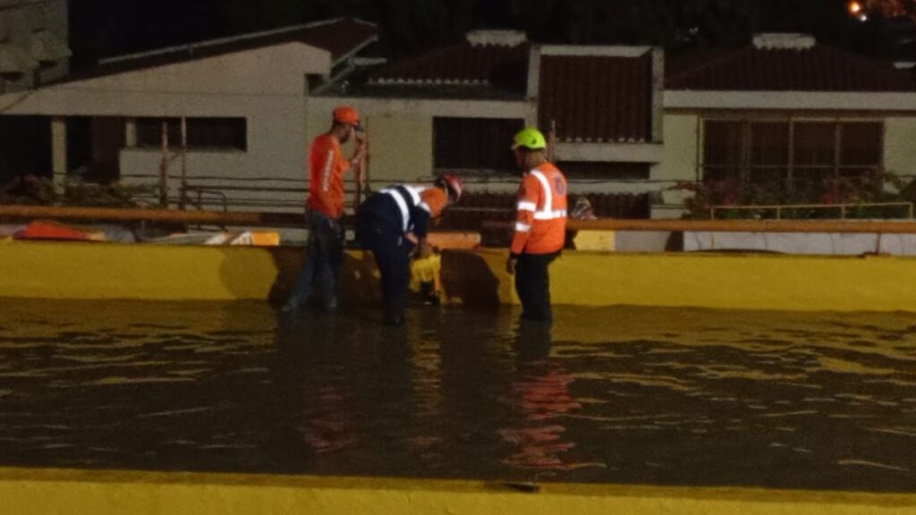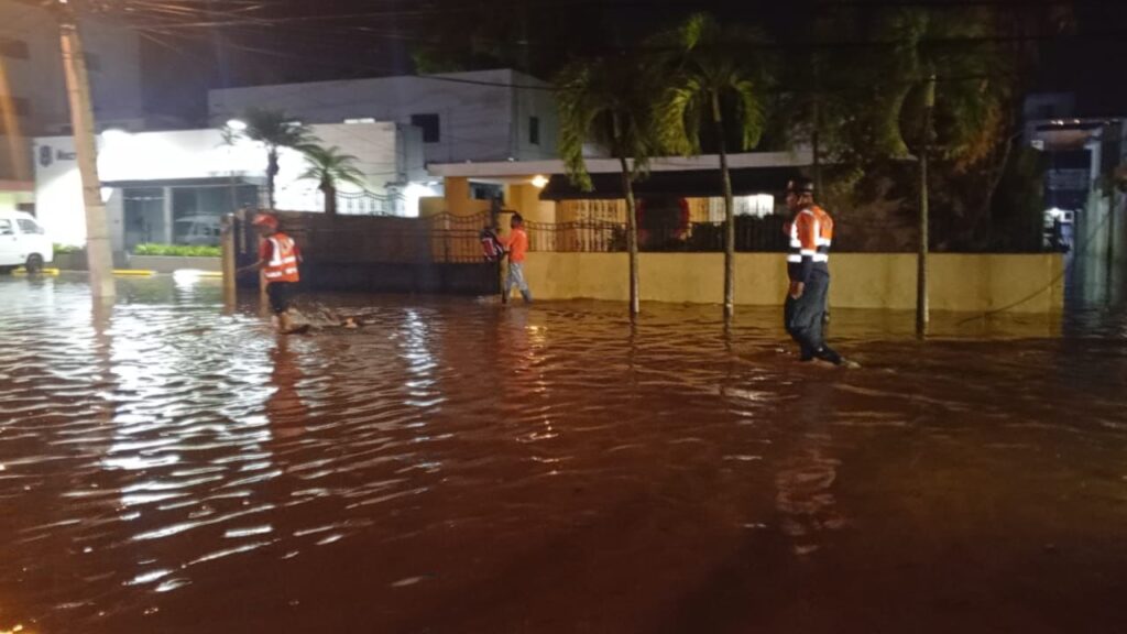 Santiago.- Personal de la Defensa Civil en esta provincia, junto a los bomberos locales, trabajó en la mitigación de las inundaciones que se presentaron en el elevado de la avenida Estrella Sadhalá y otras zonas de la parte urbana, debido a las fuertes lluvias.
