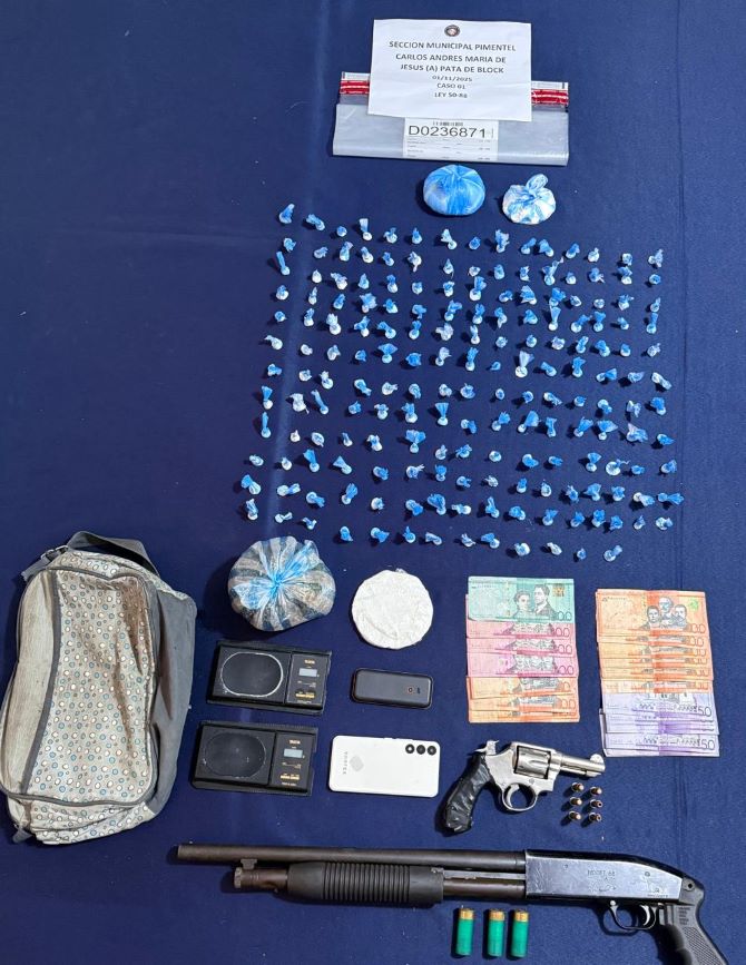 Además se incautó un revólver calibre 38, con varias cápsulas, una escopeta, una radio de comunicación, 05 celulares, RD $3,000 pesos en efectivo, dos tijeras y varios paquetes de fundas plásticas.