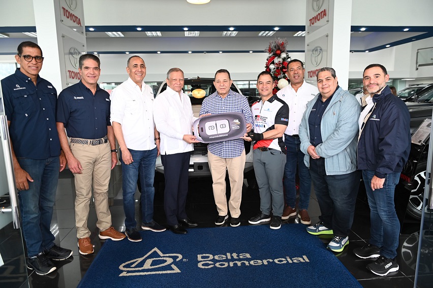El presidente ejecutivo de Banreservas, doctor Leonardo Aguilera; ejecutivos de la Familia Reservas y de Delta Comercial entregan al cliente Juan Lima su vehículo adquirido durante la feria Expomóvil 2025