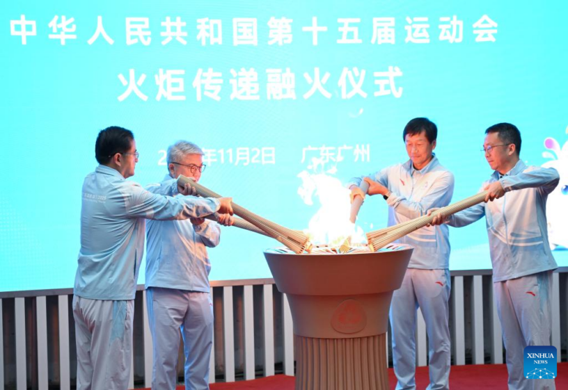 GUANGZHOU, 2 noviembre, 2025 (Xinhua) — Cuatro representantes encienden el pebetero durante la ceremonia de relevo de antorcha para los XV Juegos Nacionales de China, en Guangzhou, en la provincia de Guangdong, en el sur de China, el 2 de noviembre de 2025. (Xinhua/Deng Hua)