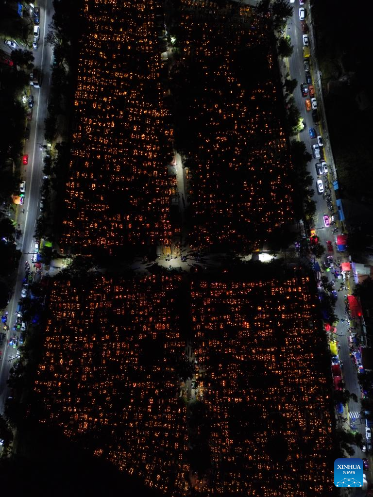 CIUDAD DE MEXICO, 2 noviembre, 2025 (Xinhua) — Imagen tomada con un dron el 2 de noviembre de 2025 de personas participando en una velada en un panteón en el marco de la celebración del Día de Muertos, en la Ciudad de México, capital de México. (Xinhua/Francisco Cañedo)