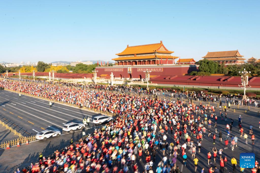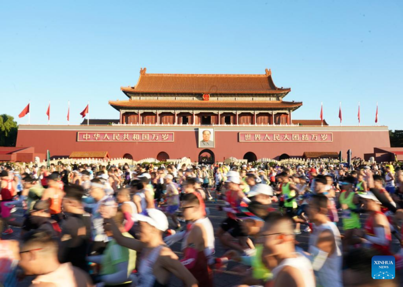 BEIJING, 2 noviembre, 2025 (Xinhua) — Participantes corren junto a la plaza de Tian’anmen durante el Maratón de Beijing 2025, en Beijing, capital de China, el 2 de noviembre de 2025. (Xinhua/Zhang Chenlin)