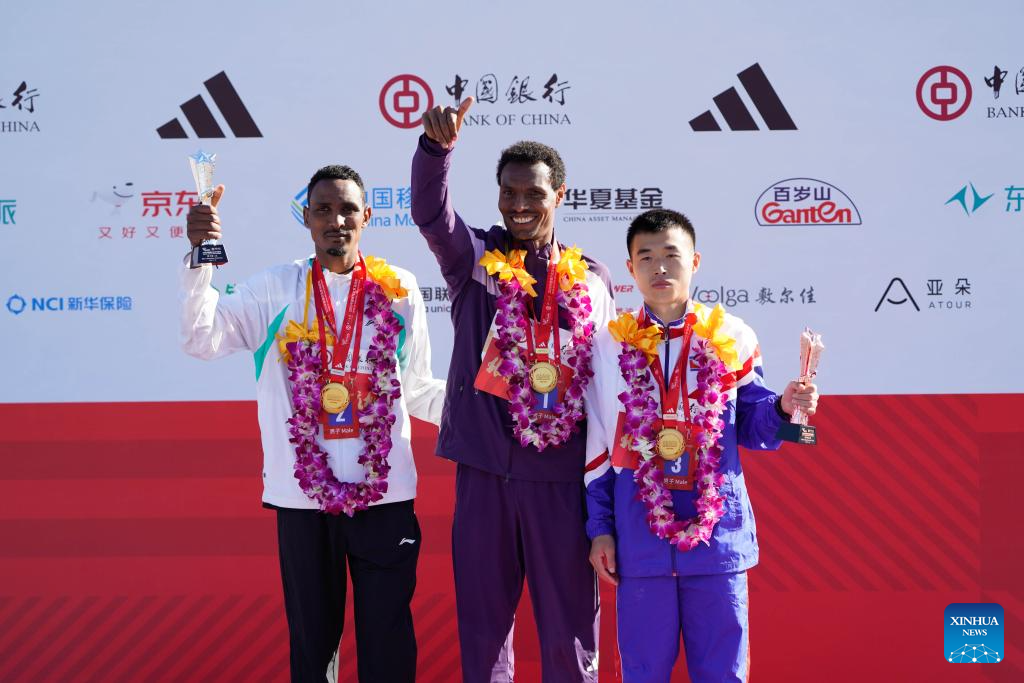 BEIJING, 2 noviembre, 2025 (Xinhua) — El ganador del primer lugar, Lemi Berhanu Hayle (c), de Etiopía, posa con el ganador del segundo lugar, Desalegn Girma Debel (i), de Etiopía, y el ganador del tercer lugar, Han Il Ryong, de la República Popular Democrática de Corea, durante la ceremonia de premiación del evento de maratón masculino del Maratón de Beijing 2025, en Beijing, capital de China, el 2 de noviembre de 2025. (Xinhua/Xie Han)