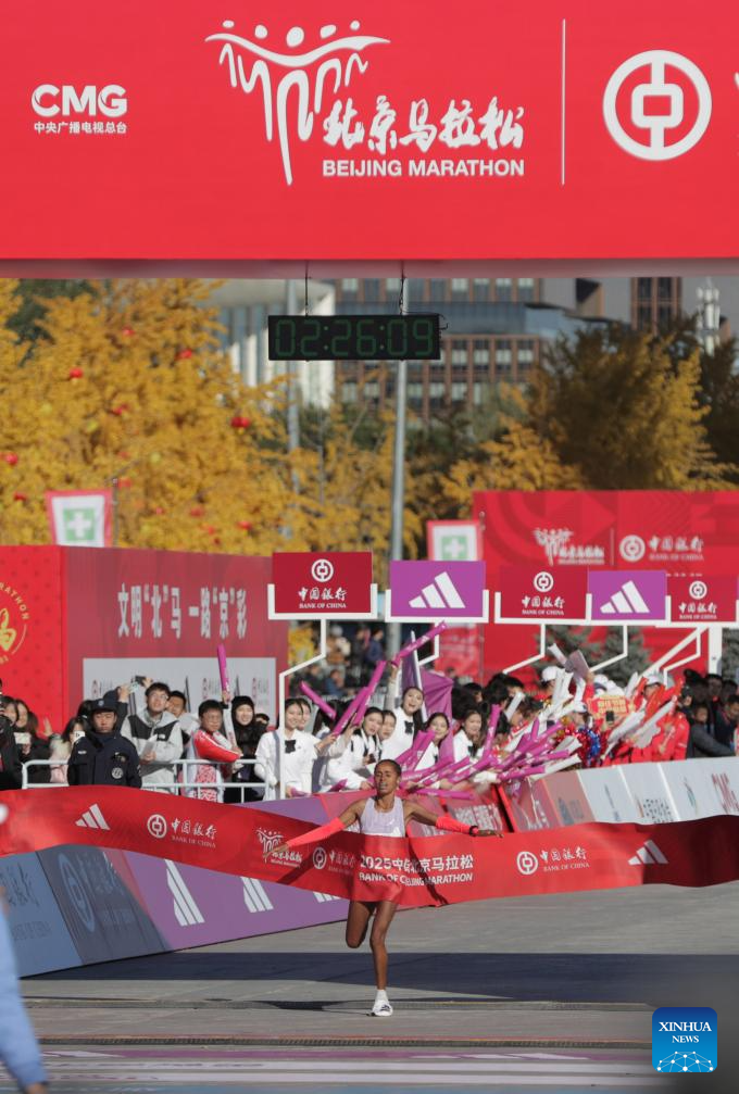 BEIJING, 2 noviembre, 2025 (Xinhua) — Anchinalu Dessie Genaneh, de Etiopía, cruza la línea de meta y gana el primer lugar en el maratón femenino durante el Maratón de Beijing 2025, en Beijing, capital de China, el 2 de noviembre de 2025. (Xinhua/Guo Yu)