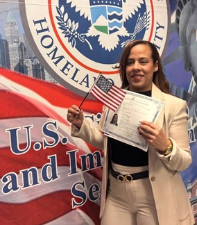 Yomary Rojas, esposa del periodista Aquiles Rojas, oriunda de Santiago de los Caballeros, por su ejemplar comportamiento ante la sociedad norteamericana, poniendo en alto la bandera tricolor, figura entre los nuevos ciudadanos estadounidenses que el Servicio de Ciudadanía e Inmigración de los EE. UU. (USCIS) juramentó en el 26 Federal Plaza-NYC. Convertirse en ciudadano(a) de USA representa un logro significativo y una oportunidad de crecimiento personal, familiar y profesional. Este estatus otorga múltiples beneficios y derechos fundamentales, que refuerzan el sentido de pertenencia y participación activa en la sociedad norteamericana. «Ser ciudadana estadounidense es una meta que he alcanzado con mucho esfuerzo y gratitud» ha declarado. Si usted la ve caminar por ahí, como lo hace de costumbre, dígale «Yomary, usted es un valor dominicano en NY»