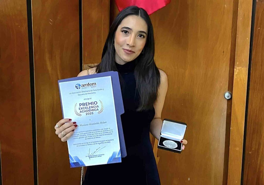 La Dra. Azul Mariana Hernández Atilano, egresada en el 2024 de la Carrera de Médico Cirujano de la Universidad Autónoma de Guadalajara (UAG), recibió el Premio a la Excelencia Académica, que entrega la Asociación Mexicana de Facultades y Escuelas de Medicina (AMFEM).