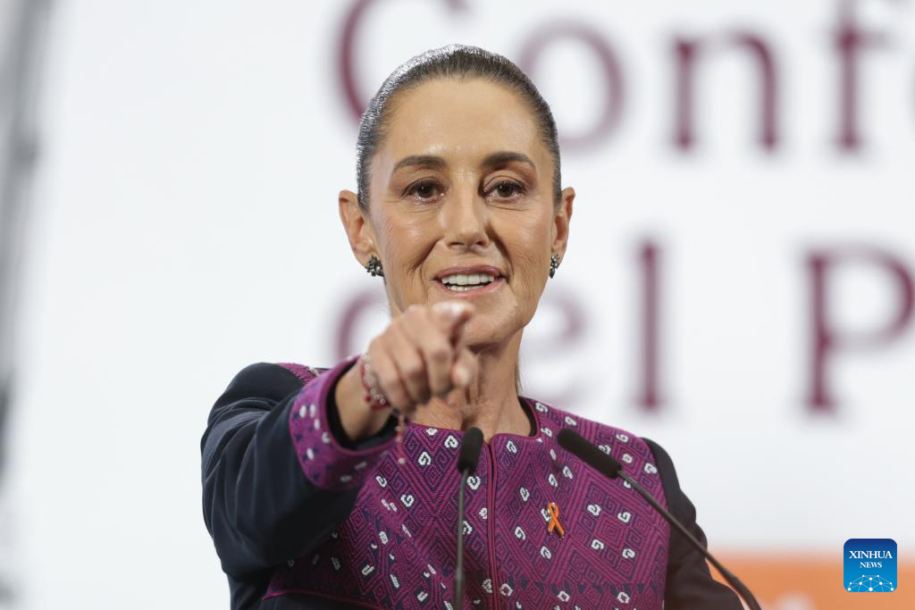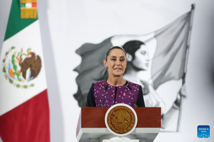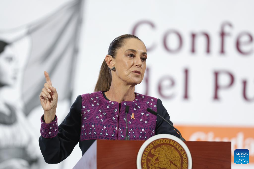 La presidenta mexicana, Claudia Sheinbaum, habla durante su conferencia de prensa matutina, en Palacio Nacional, en la Ciudad de México, capital de México, el 25 de noviembre de 2025. El Gobierno de México presentó el martes un plan de acción que busca erradicar la violencia hacia las mujeres y fomentar la igualdad de género en todos los ámbitos sociales, en el marco del Día Internacional de la Eliminación de la Violencia contra las Mujeres este 25 de noviembre. (Xinhua/Francisco Cañedo)